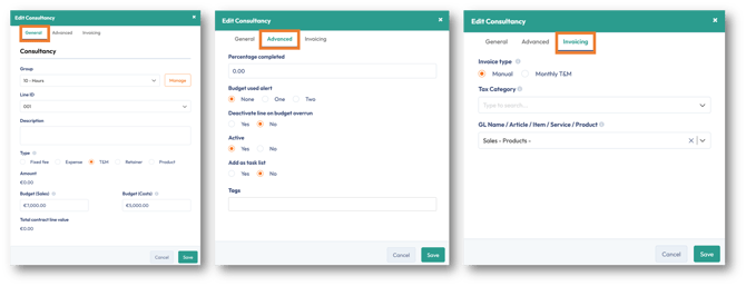 To make managing contract lines easier and more intuitive, we’ve redesigned the Contract Line layout by grouping its settings into three dedicated tabs: General, Advanced and Invoicing: