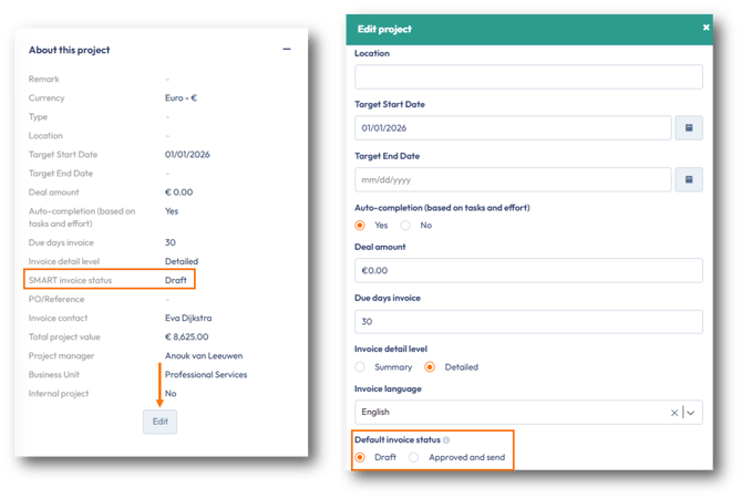 - If the project is still in Proposal/Draft stage, the invoice will be created as soon as the project is changed to Active, provided the Start Date has already passed or is the same day.