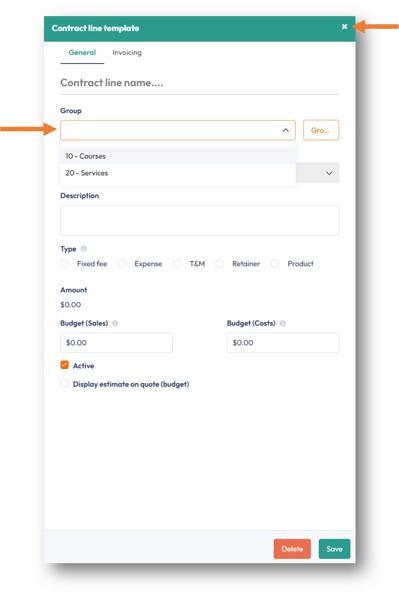 When you have finished adding the groups, click Close to return to the Contract line template dialog box. Here, you will see the contract groups in the Group drop-down list: