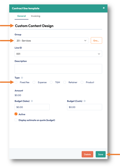 From here, you can enter the name of your contract line. In this example, we are entering the line item Custom Content Design and adding it to the contract group 20 - Services.