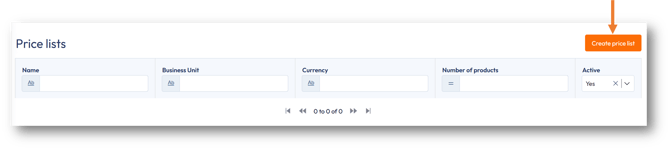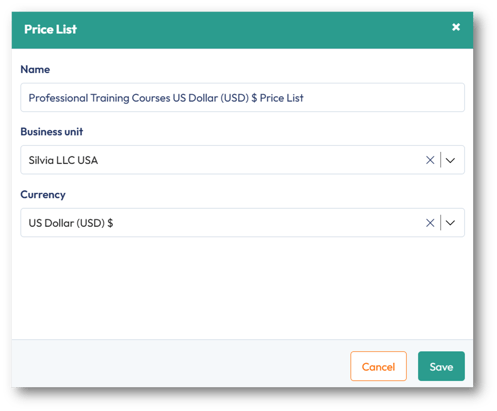 In the following window, enter the name of your price list, select the business unit and the currency. Then, click Save:
