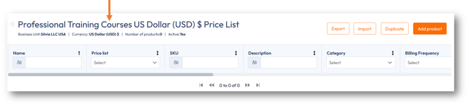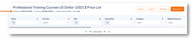 The new product price list will open, displaying the business unit and currency. When products are created and linked to a price list, the number of products will also be displayed: