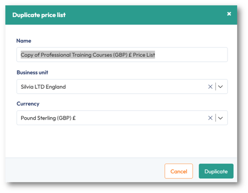 The Duplicate price list window appears, where the price list name can be modified, and a different business unit and currency can be selected: