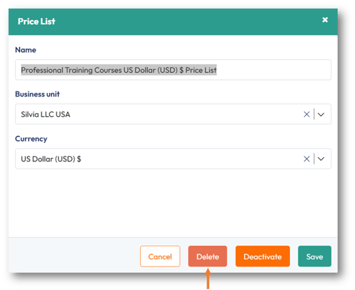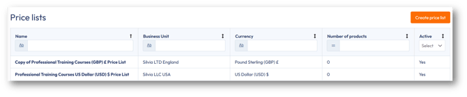 Price lists allow organizations to manage different pricing structures for various regions, currencies, or departments. For example, you might create one price list for Training Courses (EUR) under the EU Business Unit, and another for Training Courses (USD) under the US Business Unit.