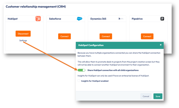 Important: Before creating a quote, please check PSOhub's Marketplace & Integration settings for HubSpot. In the menu bar, click the gear icon and select Marketplace & Integrations. In the HubSpot tile, you will see a Settings link. Clicking on this link will display the Share HubSpot connection message. By clicking the Share HubSpot connection with all child organizations switch, you can confirm that you wish to share your HubSpot account with multiple PSOhub organizations: