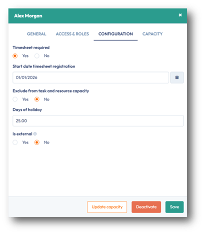 Once your new user activates his/her account, PSOhub will automatically assign to him/her the default settings related to the Days of holiday defined in the General information page. The Start date timesheet registration is automatically set when the user accepts the invite. You will also be able to refine further the capacity of this resource (e.g. 3-day week) via the Capacity tab.