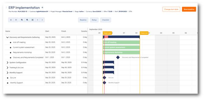 After saving, open the Timeline View to see the tasks placed within that date range. From there, you can adjust task dates, change durations, or add dependencies with full visibility.