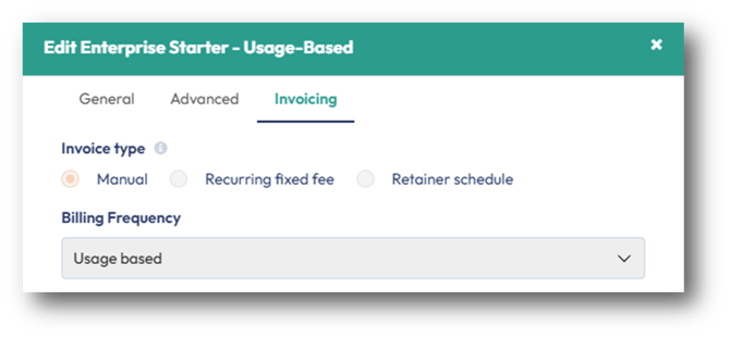 | When a Product is billed after consumption. For example, per-user, per-unit, or per-hour costs. | Usage-based | Manual |