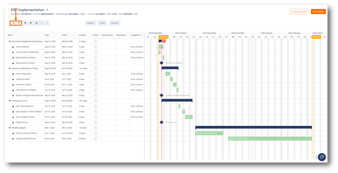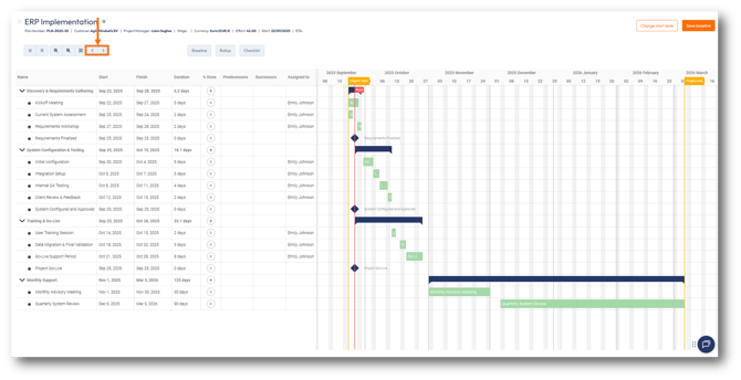 Adjust your view by zooming in, zooming out, or using the Zoom to Fit button to display the entire project span: