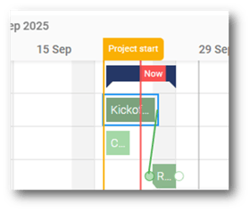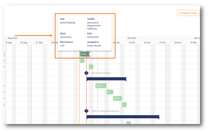 Important: Always set your project start date earlier than your first task. If a task is scheduled before the project start date, the Timeline will shift it to appear at the project start date (even though the task itself isn’t stored that way). You can adjust this using the Change Start Date button, and optionally let Copilot auto-reschedule tasks for you.