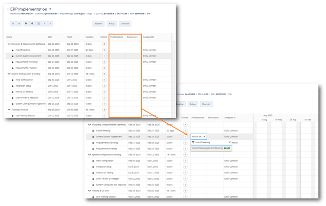 Alternatively, you can set up dependencies using the Predecessor and Successor columns: