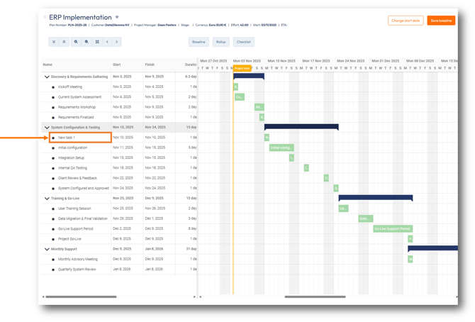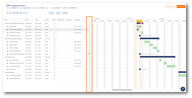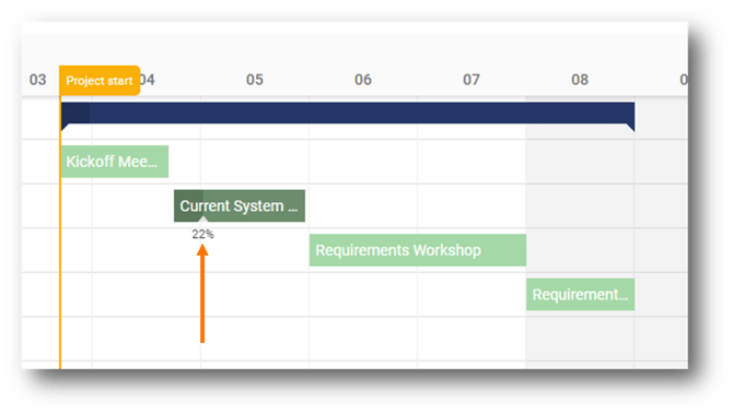 To adjust the schedule of a task, simply drag and drop the task bar along the timeline.You can also extend or shorten the bar to change the duration. This immediately updates the start and due dates of that task.