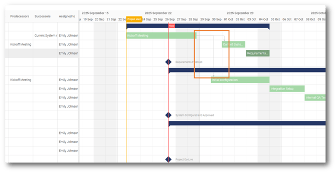 In the example below, both the Initial Configuration and the Current System Assessment tasks are dependent on the Kickoff Meeting task: