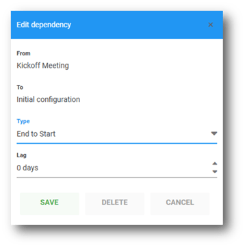 To edit the dependency details of a task, double-click the dependency line and the following dialog box appears: