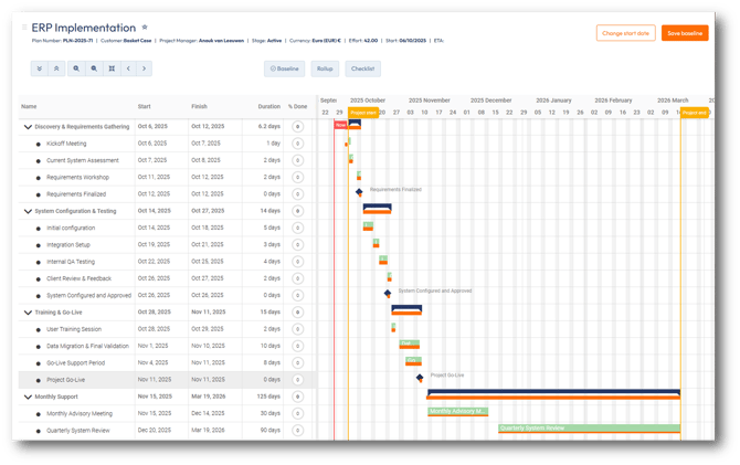 The Timeline (Gantt Chart) is a visual view of your project plan. It shows all of your tasks and milestones laid out along a calendar, so you can see exactly when work is scheduled, how tasks relate to each other, and how progress is tracking.
