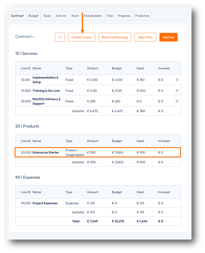 Invoice Products in PSOhub based on actual usage or consumption logged as expenses on your project.