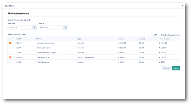 | Select the invoice period | Defines the period to invoice. The default period starts on the first day of the current year and ends on the last day of the previous month; you can overwrite this if needed. In the case of one-time Products, this is not relevant. |