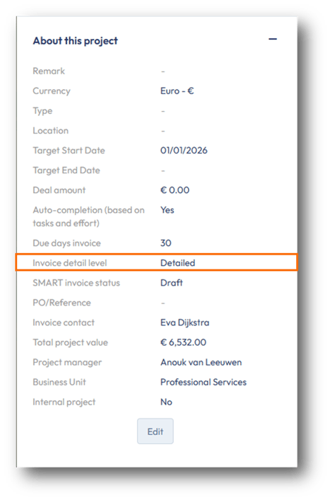 Since you're invoicing a usage-based Product, you can choose how detailed your invoice should be. In the left hand pane of the project, under Invoice Detail Level, choose: