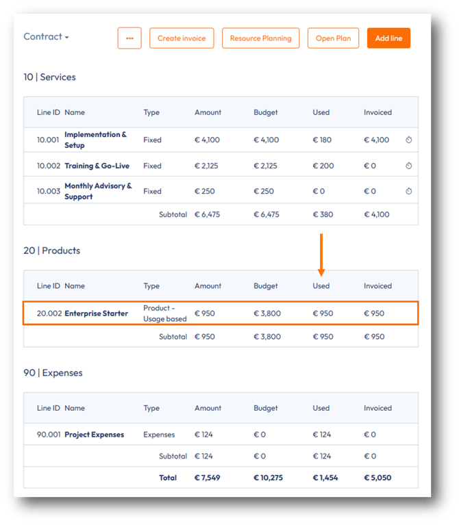 The Used column in the Contract will display the total expense amount logged for the Product.