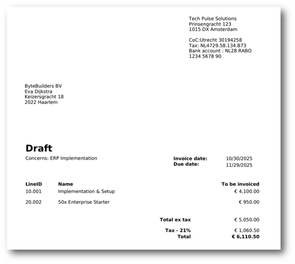 In the Invoice tab, review the totals per Product line, tax calculations, and overall invoice amount.