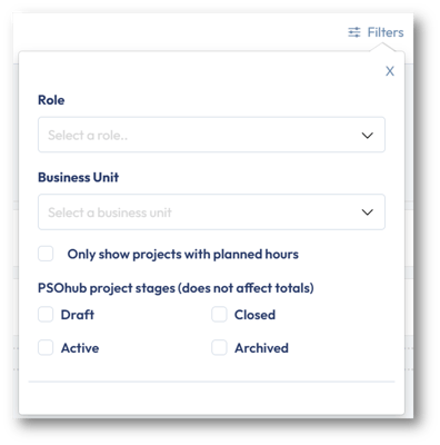 It's possible to filter your planning based on your role, business unit, your projects, and project stages. To do this, click on Filters in the top-right corner: