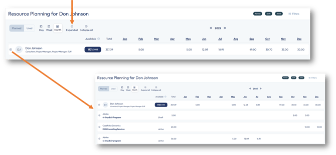 To view your planned hours across all projects, click on either the Expand all button or click on the down arrow icon next to your name. Once expanded, all projects will be listed: