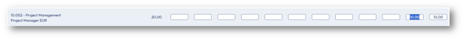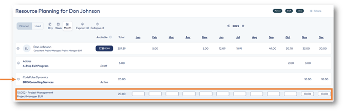 In the above example, the project DMS Consulting Services for the customer CodePulse Dynamics displays planned hours for the Project Management contract line in November and December.