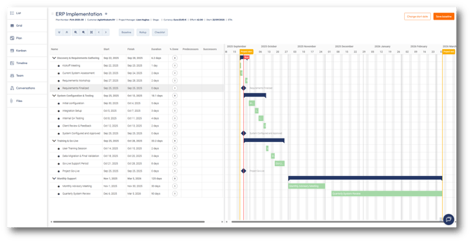 The Grid view presents all your tasks in a structured, tabular layout. This view is ideal for managing tasks quickly and efficiently across a large plan.