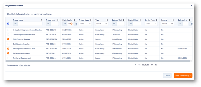 Saves time by applying rate increases across multiple projects in one action.