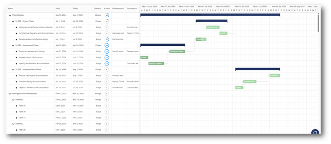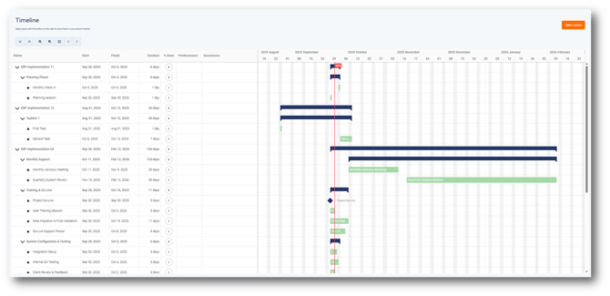 The Overall Timeline (Gantt Chart) in PSOhub gives you a consolidated, big-picture view of your projects. It shows how multiple projects align, overlap, and progress relative to each other, bringing several project plans into a single, visual schedule. This makes it easier to track milestones, dependencies, and delivery dates across your portfolio.