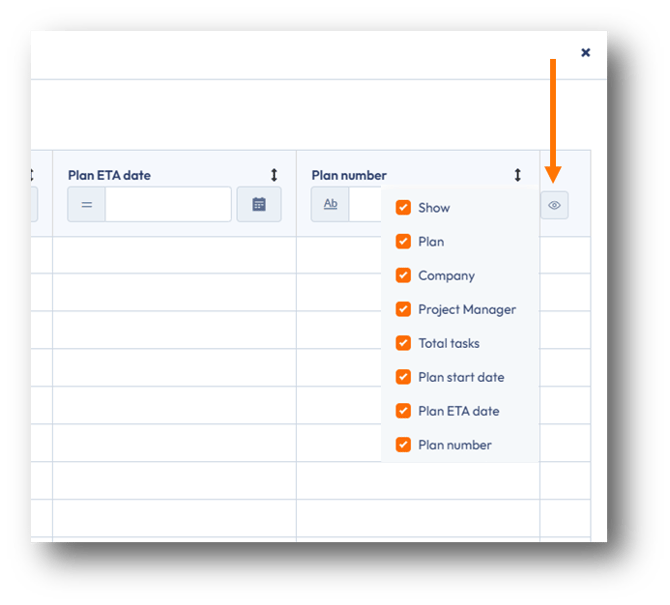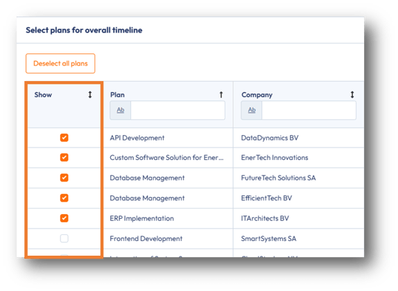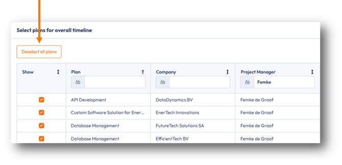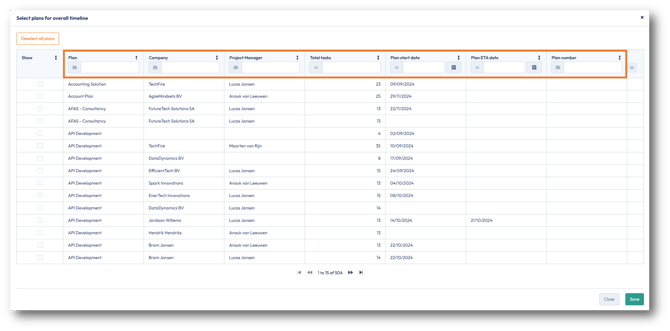 In the dialog window that appears, search or filter to find the projects you want to include. You can filter by Plan, Company, Project Manager, Dates, and Task Count.