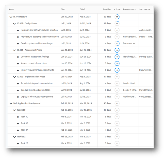 The grid displays a clear hierarchy of your projects: Plans → Tasklists → Tasks. You can expand or collapse levels of the hierarchy to view as much or as little detail as you need.