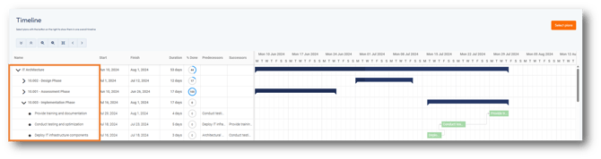 The Overall Timeline is split into two panels: a grid on the left and a Gantt chart on the right. Together, these give you both a structured breakdown of your projects and a visual schedule.