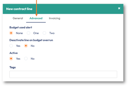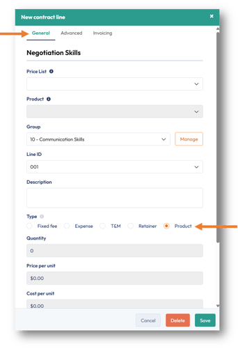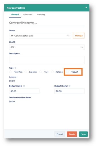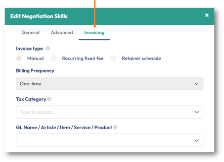 Invoice type | Pre-define how to invoice the contract line, whether manually, a recurring fixed fee, or a retainer schedule. |