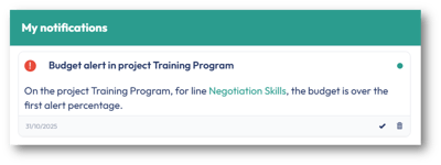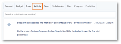 You can set up one or two budget alerts. When the expenses booked against a contract line reach the percentage specified for the first alert, a notification will appear in your project’s Activity feed. The same will happen for the second alert, if you have configured one. If you have checked the Alerts box for any team member of your project, the alert will show up as a notification in PSOhub and/or an email: |