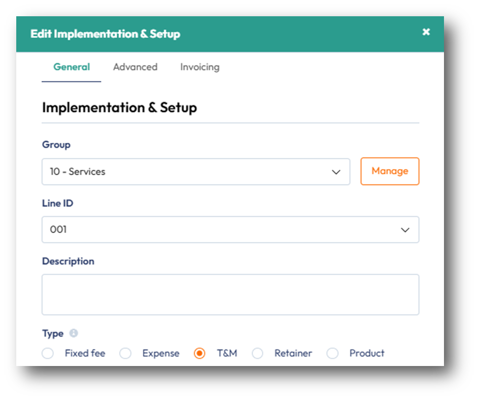 A contract line is defined with a Name and a Line ID and it is always part of a Group. You can also further define your contract line with a description that will appear on the invoice.