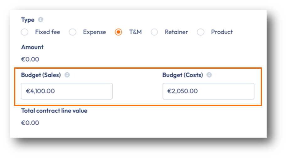 The financial information of a T&M contract line will be displayed in the four following fields: Amount, Budget (Sales), Budget (Costs), and Total Value.