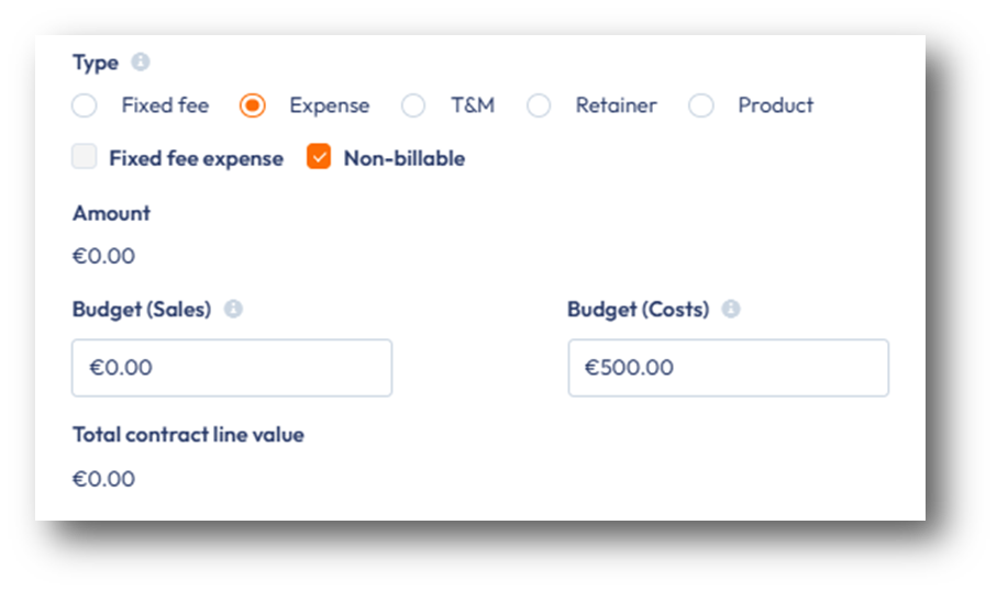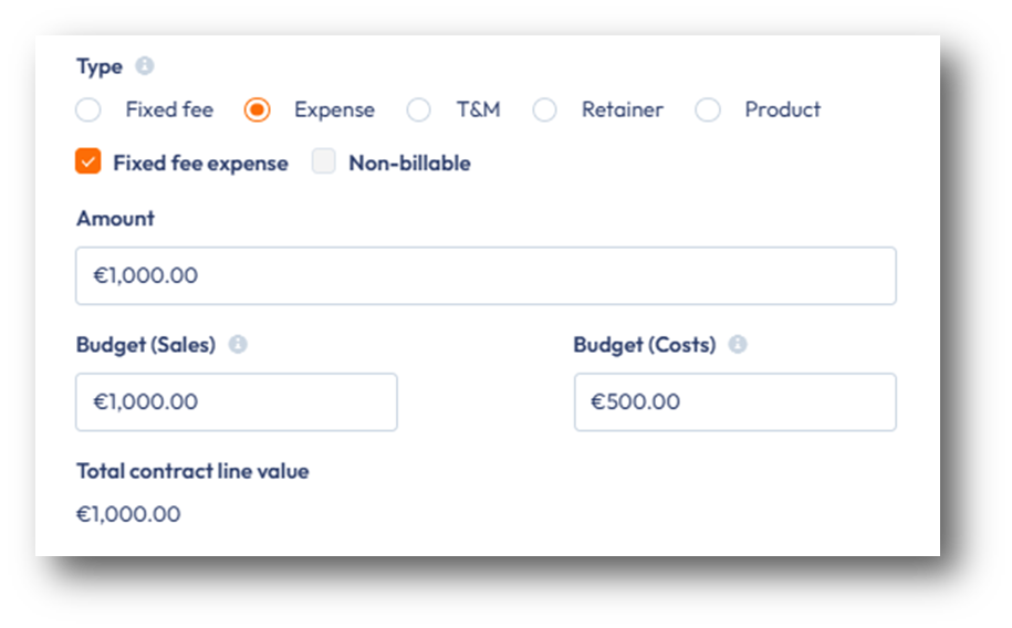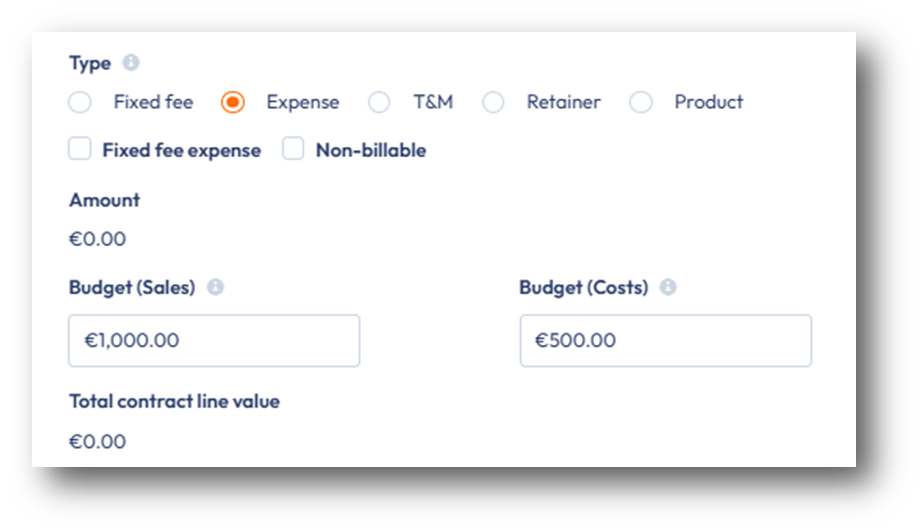 The financial information of an Expense contract line will be displayed in the four following fields: Amount, Budget (Sales), Budget (Costs) and Total value.