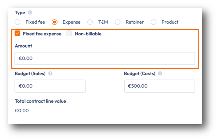 A fixed fee expense will allow you to enter a value in the Amount field that will be invoiced no matter what the actual expenses booked on the contract line. An Expense contract line set as fixed fee will behave the same way as a Fixed Fee contract line (related to Hours).